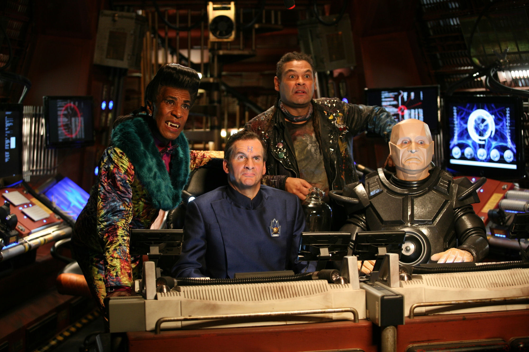 The image shows, from left to right, Danny John-Jules as The Cat, Chris Barrie as Arnold Rimmer, Craig Charles as Dave Lister, and Robert Llewellyn as Kryten aboard the eponymous mining spaceship. Click on the thumbnail on the right for a bigger version.
